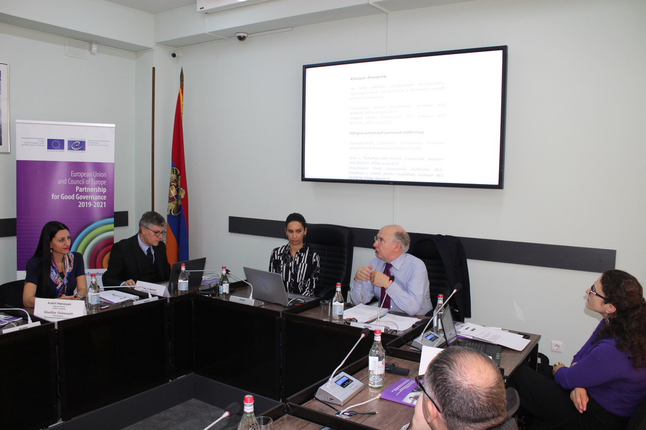 ԵԽ երևանյան գրասենյակի ծրագրի ղեկավար Գայանե Հովհաննիսյանն ևս ողջունեց ներկաներին, ներկայացրեց իրականացվող ծրագրի կարևորությունը, հիմնական ուղղությունները և միջազգային փորձագետներ Ջերեմի ՄքԲրայդին և Լիլիան Ապոստոլին: «Ակադեմիայի հետ համագործակցությունն արդյունավետ է և շարունակական»,-նշեց Գայանե Հովհաննիսյանը: