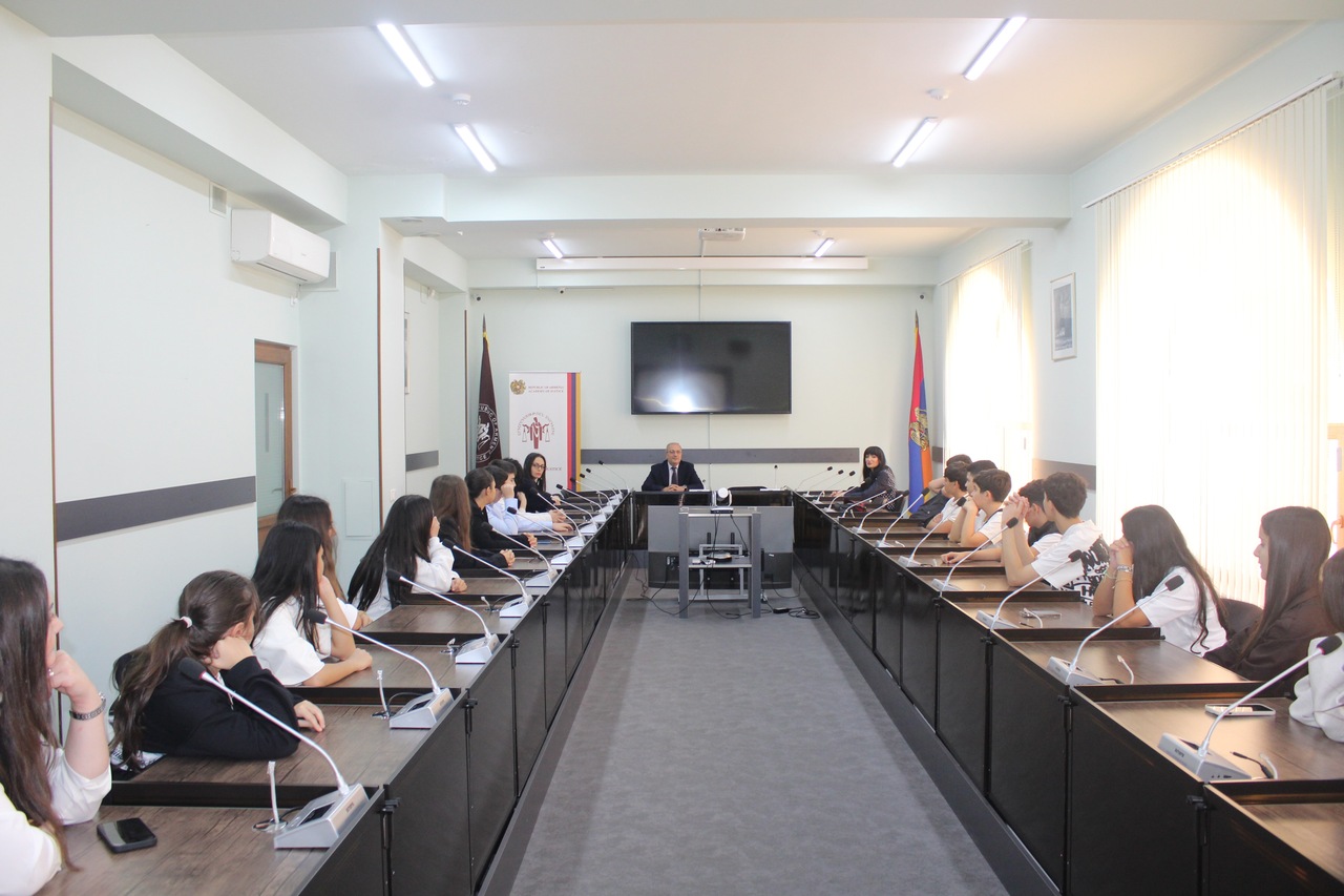 Աշակերտները հնարավորություն են ունեցել հանդիպել Ակադեմիայի ռեկտոր Սերգեյ Առաքելյանին: Ռեկտորը դպրոցականներին է ներկայացրել դատավոր, դատախազ, քննիչ դառնալու գործընթացը, խոսել իրավաբանի մասնագիտության առանձնահատկություններից, պատասխանել հետաքրքրող հարցերին: