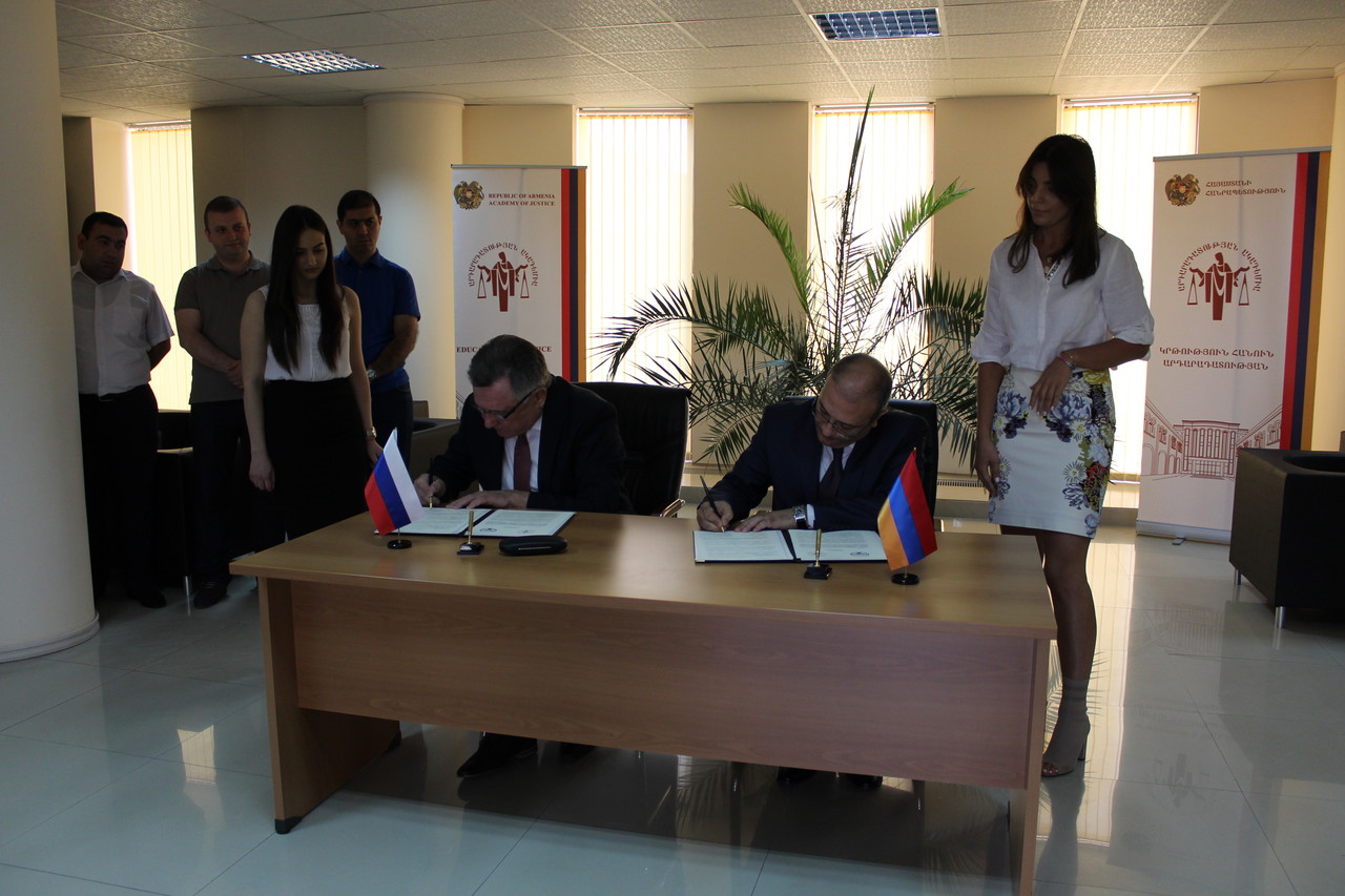 Հունիսի 21-ին Արդարադատության ակադեմիայում տեղի ունեցավ համագործակցության հուշագրի ստորագրման հանդիսավոր արարողությունը: Միջոցառմանը ներկա էին Ակադեմիայի կառավարման խորհրդի անդամները, ունկնդիրները, աշխատակազմը: Փաստաթուղթը ստորագրեցին Սերգեյ Առաքելյանը և Վալենտին Երշովը: Հուշագիրն ամրագրեց փոխադարձ հետաքրքրություն ներկայացնող ոլորտներում համագործակցելու ցանկությունը: