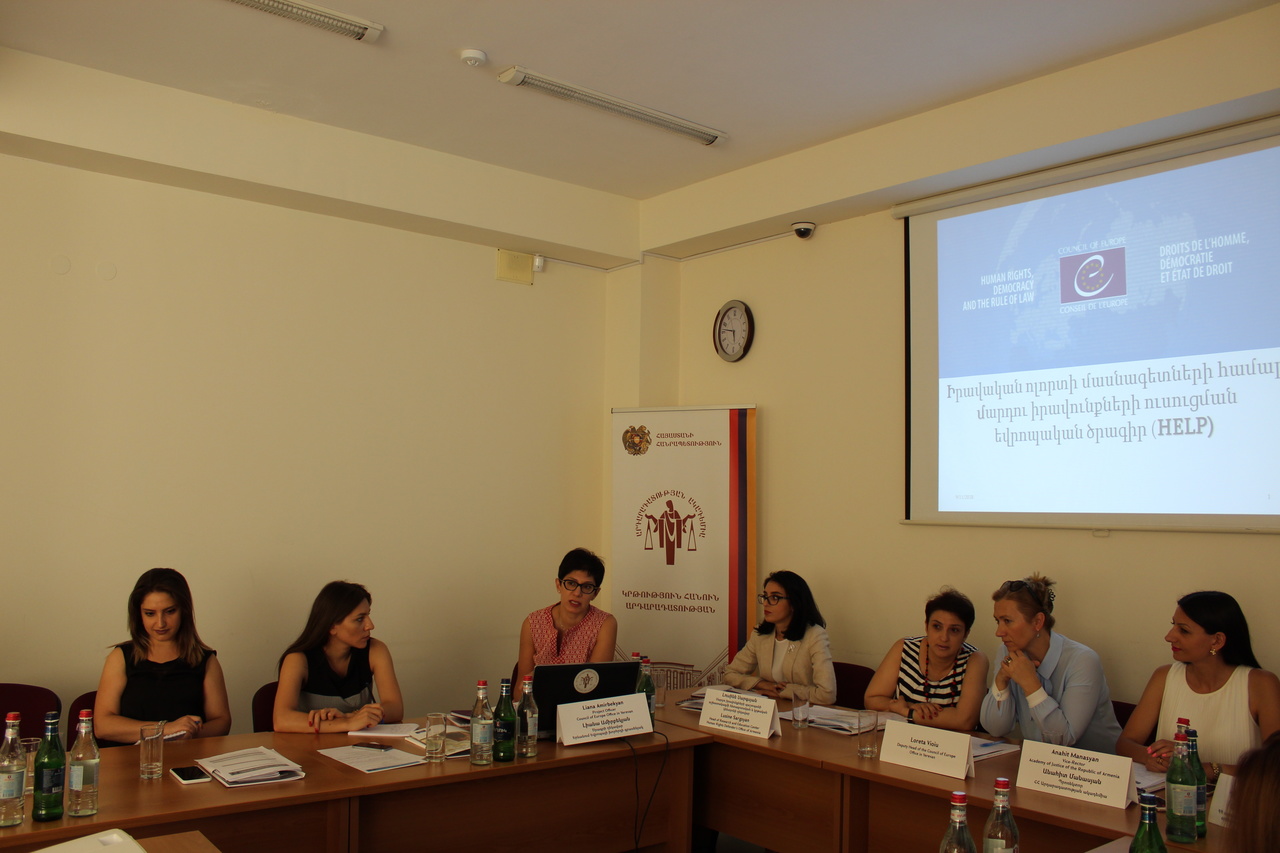 Սեպտեմբերի 11-ին Արդարադատության ակադեմիայում անցկացվեց «Բռնություն կանանց նկատմամբ և ընտանեկան բռնություն» թեմայով Եվրոպայի Խորհրդի (ԵԽ) HELP ծրագրի (Մարդու իրավունքների կրթություն իրավական ոլորտի մասնագետների համար) դասընթացի մեկնարկային հանդիպումը: Ներկա էին Արդարադատության ակադեմիայի գիտական աշխատանքի գծով պրոռեկտոր Անահիտ Մանասյանը, Երևանում ԵԽ գրասենյակի ղեկավարի տեղակալ Լորետա Վիոյուն, ներկայացուցիչներ ՀՀ արդարադատության նախարարությունից, ՀՀ մարդու իրավունքների պաշտպանի գրասենյակի աշխատակազմից, ինչպես նաև վերոնշյալ դասընթացի մասնակիցները՝ դատավորներ, դատախազներ, քննիչներ, ՀՀ փաստաբանական դպրոցի ունկնդիրներ, ուսանողներ: