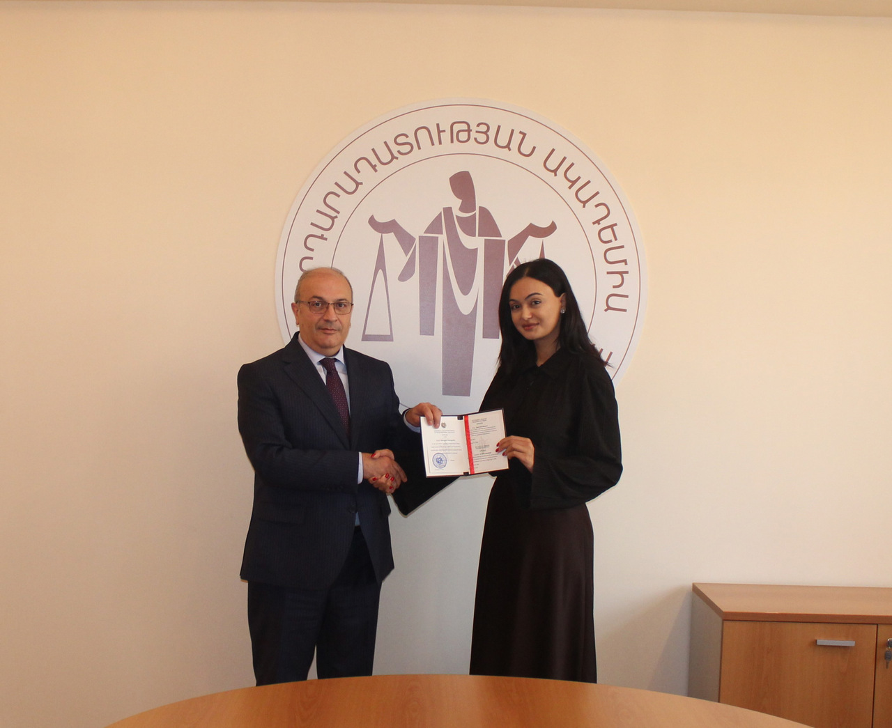 Նոյեմբերի 14-ին Արդարադատության ակադեմիայում ռեկտոր Սերգեյ Առաքելյանը դիպլոմներ հանձնեց Ապօրինի ծագում ունեցող գույքի բռնագանձմանն ուղղված գործառույթներ իրականացնող դատախազների թեկնածությունների 2025 թվականի ցուցակում ընդգրկված անձանց: Դիպլոմ ստացավ 3 շրջանավարտ: